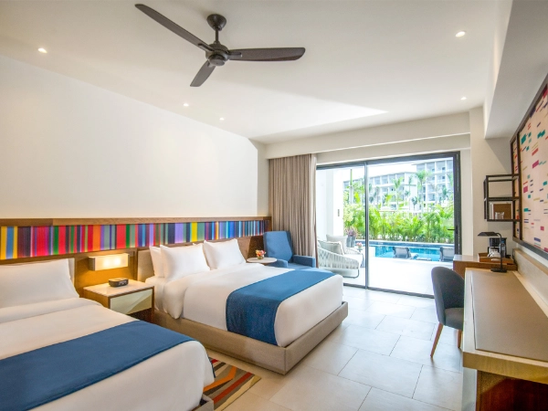 Air conditioning, TV, Telephone, Alarm clock radio, In-room safe, Iron, Mini-bar, Coffee maker, Swim up pool.