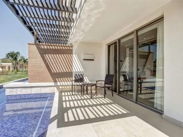 Terrace, AC and ceiling fan, TV, In-room safe, Mini-bar, Access to semi-private pool.