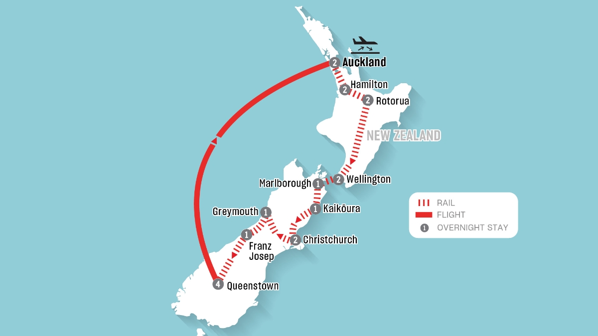 You’ll travel aboard New Zealand’s renowned scenic trains, including the Northern Explorer, Coastal Pacific and the breathtaking TranzAlpine, all while enjoying expertly guided excursions, boutique accommodations and locally inspired cuisine. Along the way, discover vibrant cities like Auckland, Wellington and Christchurch, charming towns such as Kaikōura and Franz Josef, and natural wonders including Rotorua’s geothermal valleys, the Southern Alps and the majestic Milford Sound and Queenstown.