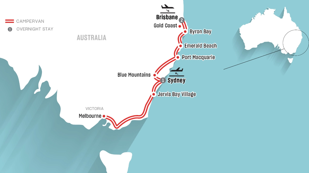Begin your Aussie Road Trip Adventure in the campervan, which you’ll have for the next 19 nights /20 days. The suggested itinerary takes you from Queensland through New South Wales, into the Australian Capital Territory and Victoria.