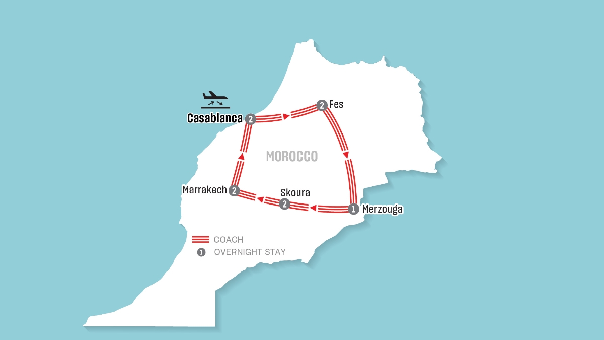 Experience Morocco’s imperial cities, breathtaking landscapes and timeless traditions on this unforgettable journey. From Casablanca to Fes and Marrakech, travel through ancient medinas, Roman ruins, mountain passes and golden Sahara dunes, complete with a memorable camel ride at sunset. A perfect blend of culture, history and adventure awaits.