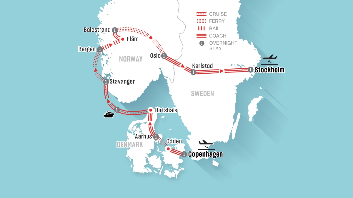 • Round-trip flights, fly to Copenhagen and return from Stockholm (if the Flight & Hotel package option is chosen)