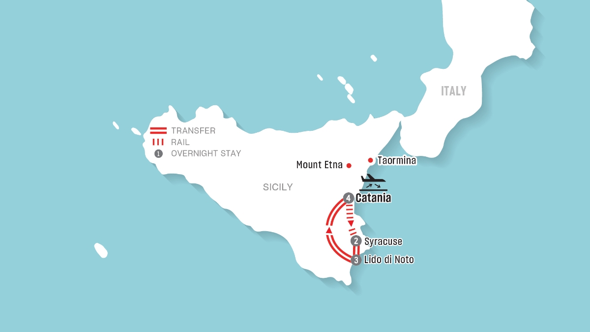 After breakfast, meet your driver for your transfer to Catania and enjoy your final evening in Sicily. You may wish to take one last stroll through Catania’s lively streets, savour fresh seafood at a local trattoria, or toast your journey with a glass of Sicilian wine.