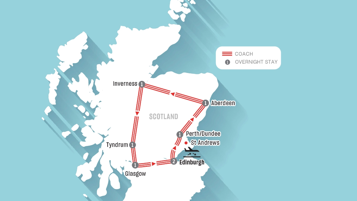 - Visits: Edinburgh Castle, Photo stop at Dunnottar Castle, Aberdeen Maritime Museum, Elgin Cathedral, Fort George, Urquhart Castle, Glencoe Visitor Centre, Glasgow Cathedral, visit to a distillery with tasting, The Kelpies