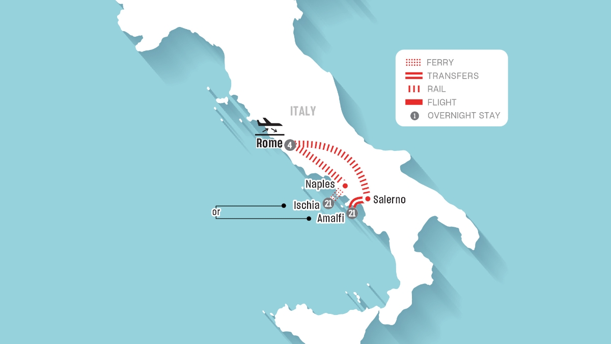 - Rome (3 nights), Ischia (21 nights), Rome (1 night)