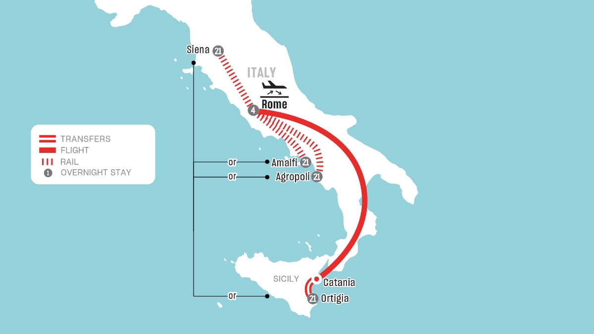 •    Rome (3 nights), Sicily (21 nights), Rome (1 night)