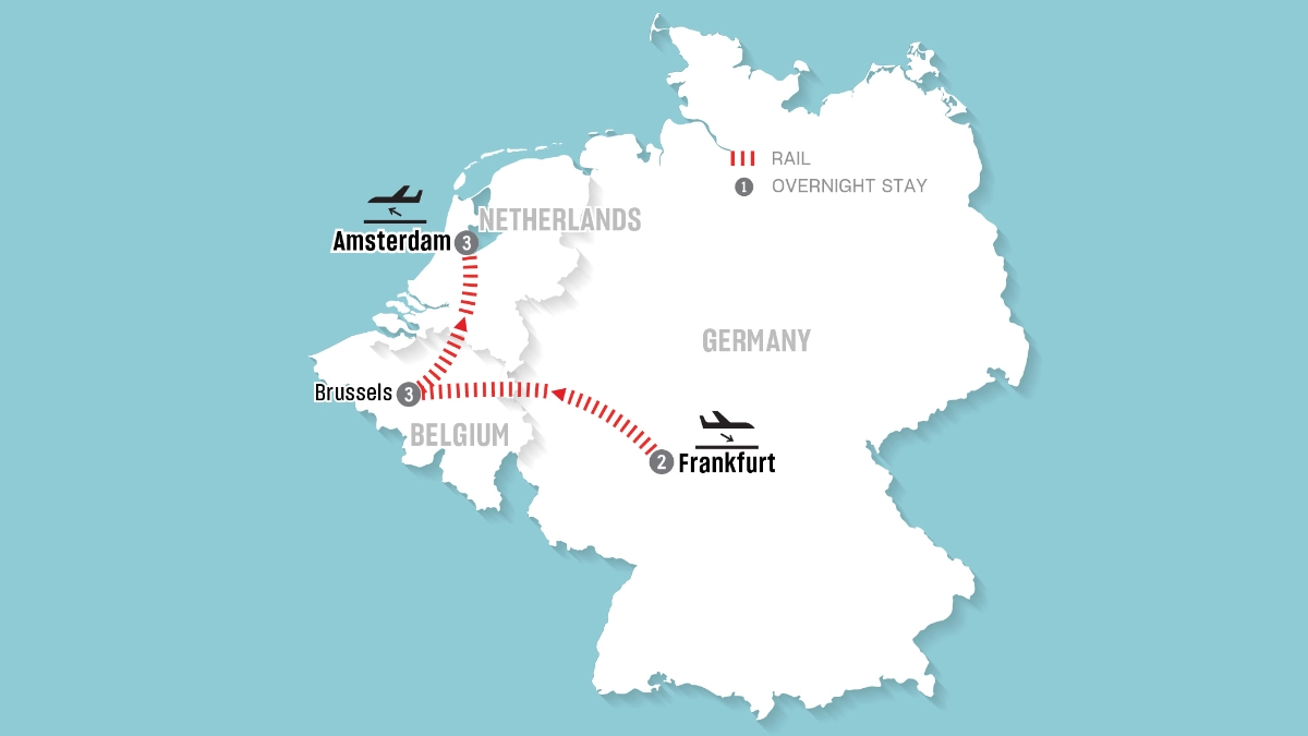 - Round-trip flights to Frankfurt and return from Amsterdam (if Flight & Hotel package option is chosen)