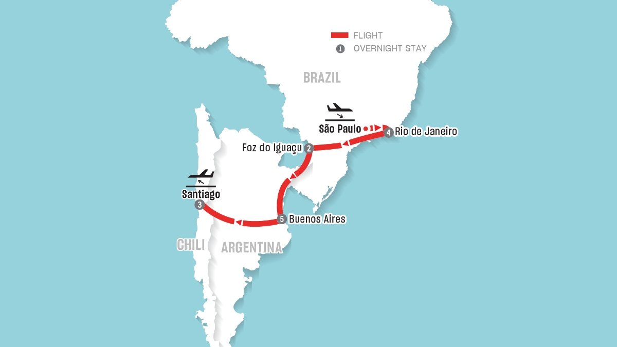 - One-way flights in economy class from: São Paulo - Rio de Janeiro, Rio de Janeiro - Foz do Iguaçu, Foz do Iguaçu - Buenos Aires, Buenos Aires - Santiago
