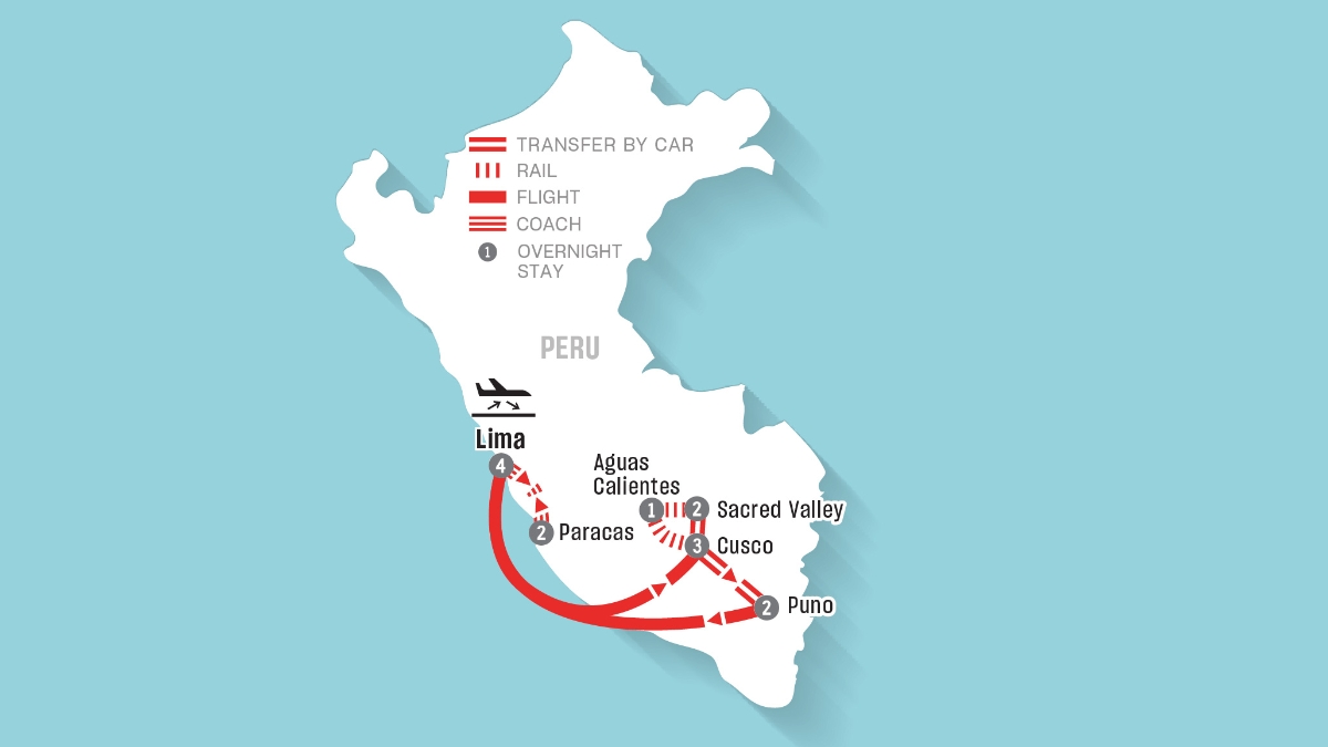 - 14 nights accommodation in select category (4 nights in Lima, 2 nights in Paracas, 2 nights Sacred Valley, 1 night in Aguas Calientes, 3 nights in Cusco and 2 nights in Puno)