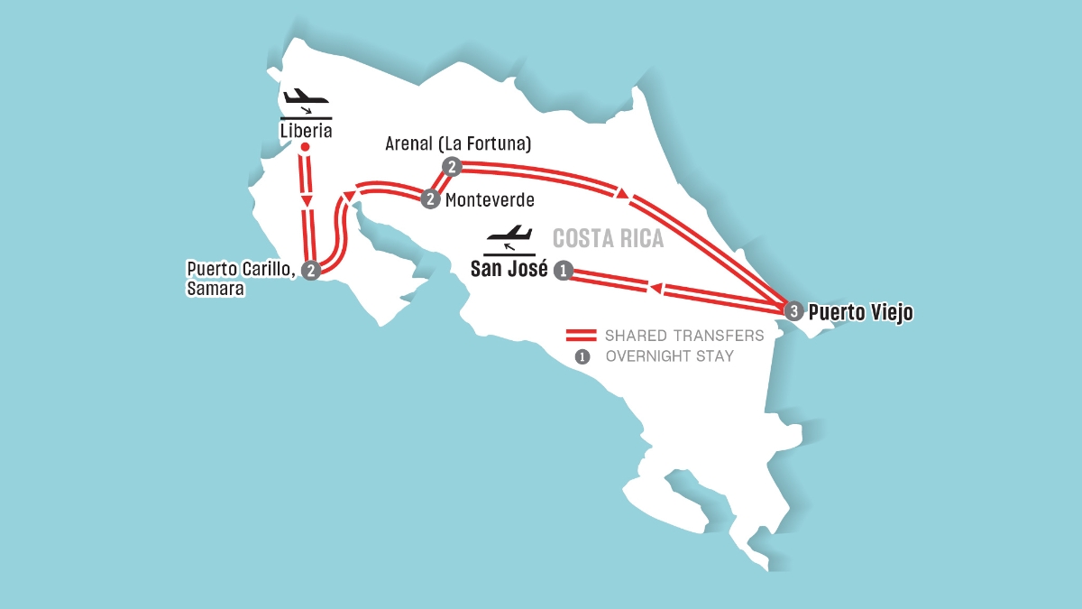 Experience the diverse beauty of Costa Rica with this exceptional tour package that takes you to both coasts, as well as the enchanting Cloud Forest in Monteverde and the lush Arenal Rainforest. Your adventure begins upon arrival at Liberia International Airport, followed by a journey to Playa Carrillo in the Sámara region, a hidden gem on the Pacific Coast known for its charming local businesses and stunning beaches. After, a couple of nights in Monteverde, where you will engage in an exciting excursion, the tour continues to the iconic Arenal area, a must-visit destination renowned for its breathtaking landscapes. Following your rainforest exploration, you will head to the South Caribbean, specifically Puerto Viejo Beach, which offers a unique cultural experience with its distinct cuisine, beautiful beaches and vibrant lifestyle. The tour concludes with an overnight stay in San José, preparing you for your departure back home.