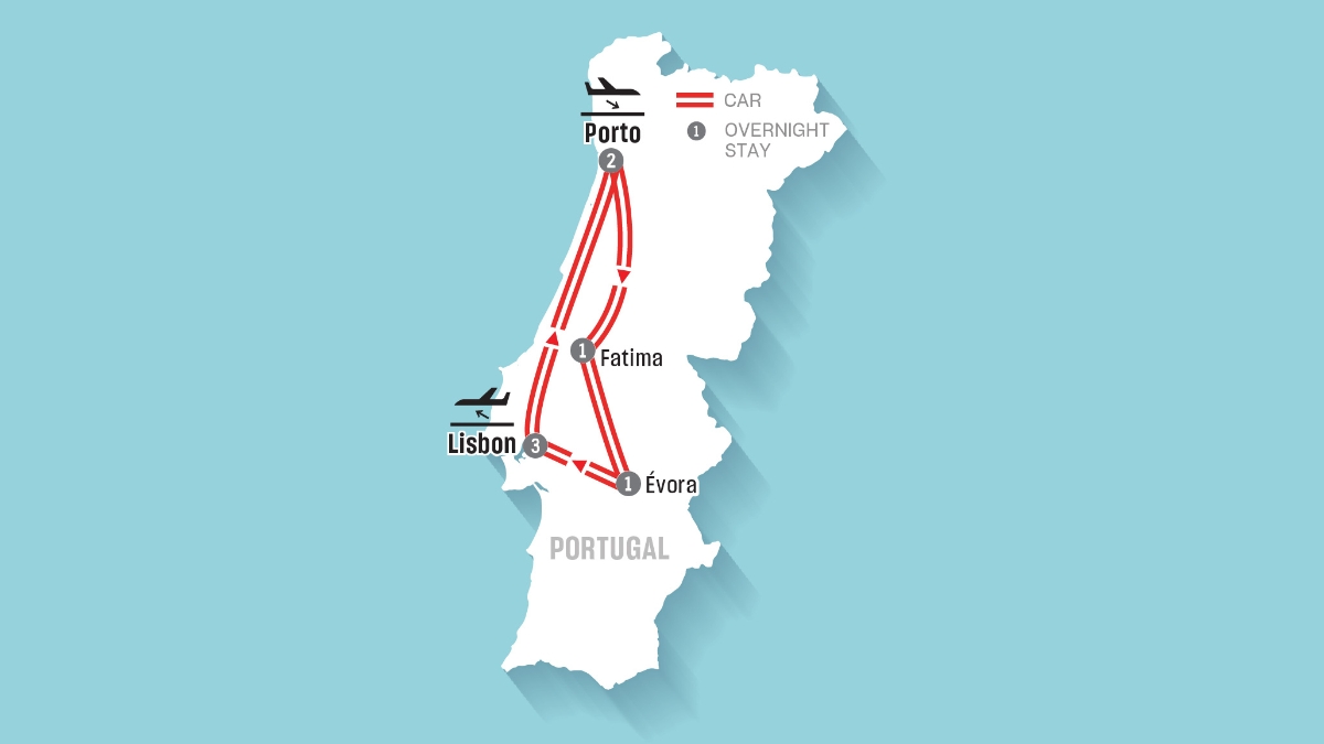 This classic self-drive, self-guided tour combines Portugal’s two main cities, Lisbon and Porto, and overnights in Alentejo and Santarem.
