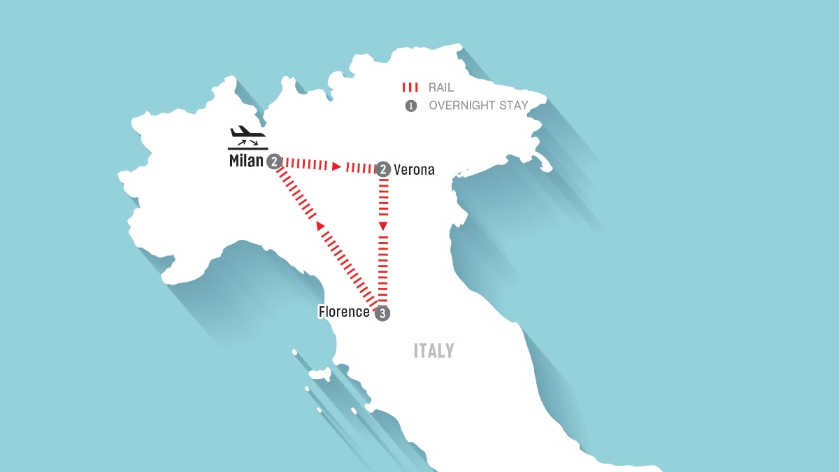 - Train ticket from Milan to Verona, Verona to Florence, Florence to Milan in the selected class of service