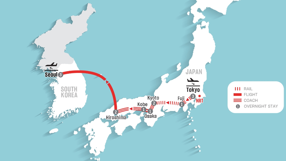 - 13 nights accommodation in Superior Accommodation (3 nights in Tokyo, 1 night in Fuji, 2 nights in Kyoto, 1 night in Osaka, 1 night in Kobe, 2 nights in Hiroshima, 3 nights in Seoul)