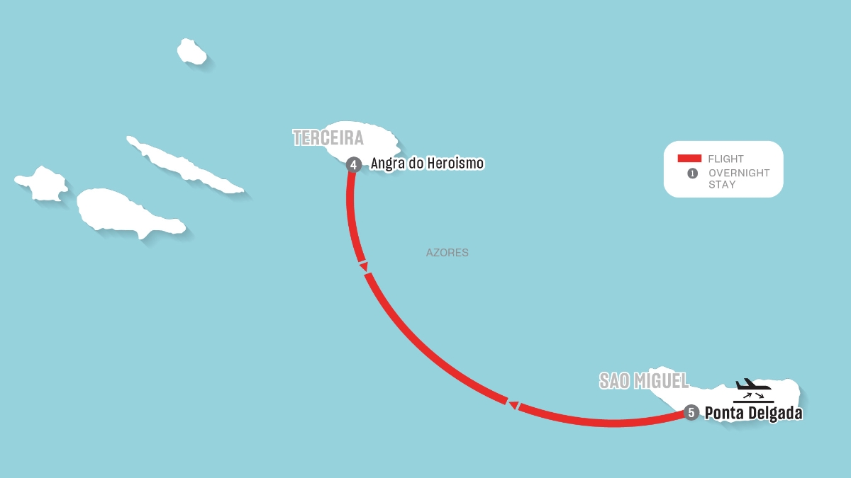 - Private transfers: Round-trip transfers in Ponta Delgada on arrival/departure and for domestic flight to Terceira, Round-trip between Angra airport and hotel, Ponta Delgada airport to hotel
