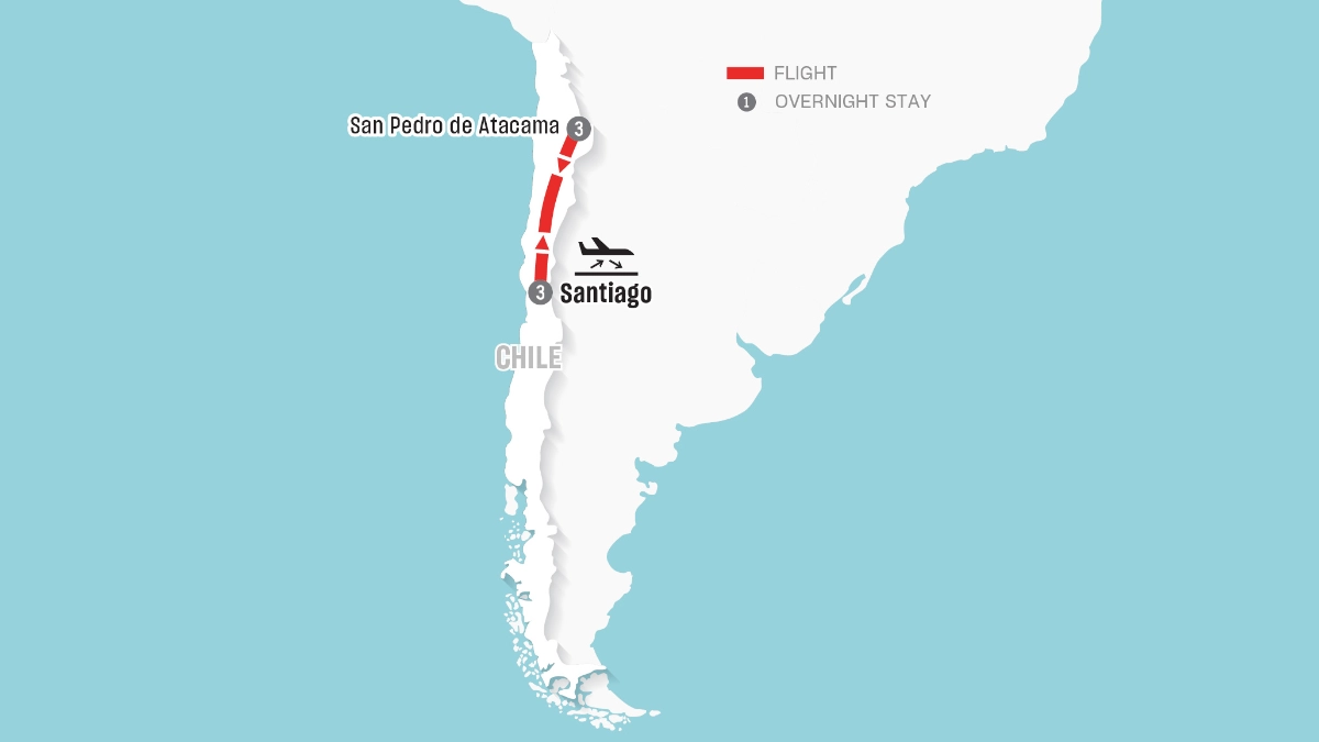 Immerse yourself in the perfect blend of urban sophistication and natural wonder on this unforgettable journey through Chile. Begin in Santiago, a city where sleek modern skyscrapers harmonize with charming architecture, and vibrant neighbourhoods pulse with life, art and culture. Then, venture into the breathtaking landscapes of San Pedro de Atacama, where the lunar-like Valley of the Moon, the glistening Atacama Salt Flat and the awe-inspiring El Tatio Geysers await.