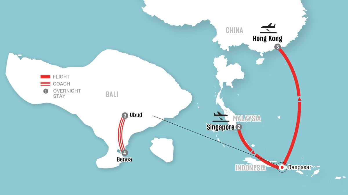 - 12 nights in Superior accommodation (2 nights in Singapore, 3 nights in Ubud, 4 nights in Benoa-Bali, 3 nights in Hong Kong)