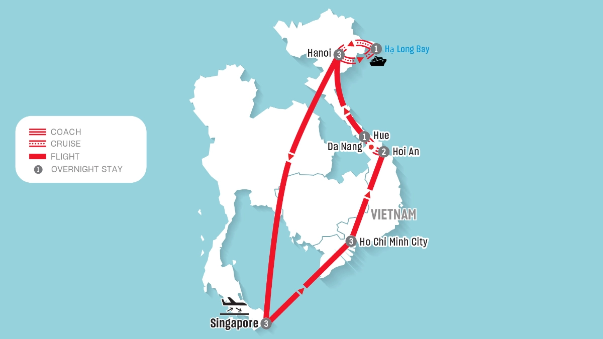• Flight from Singapore to Ho Chi Minh City, from Ho Chi Minh City to Da Nang, from Hue to Hanoi, from Hanoi to Singapore