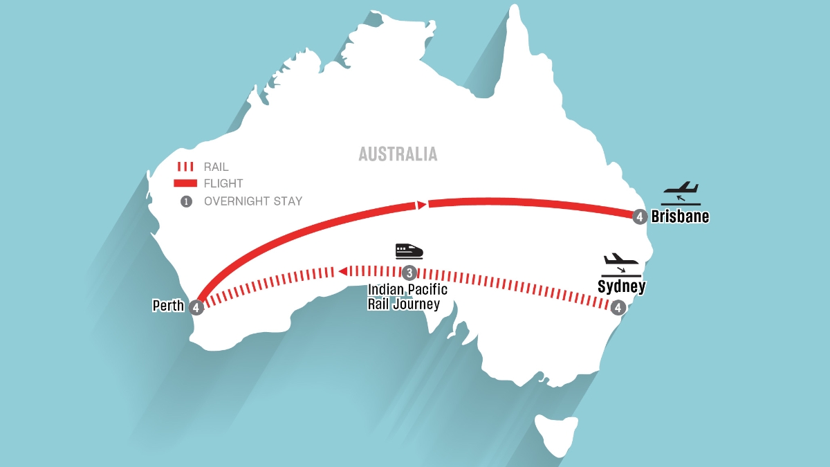 Next, step aboard the legendary Indian Pacific Rail Journey, one of the world’s great train experiences. Travel across the vast Australian continent, stopping to explore the artistic heritage of Broken Hill, the wine-rich region of McLaren Vale and the cultural charm of Adelaide, before arriving in the laid-back western capital of Perth.